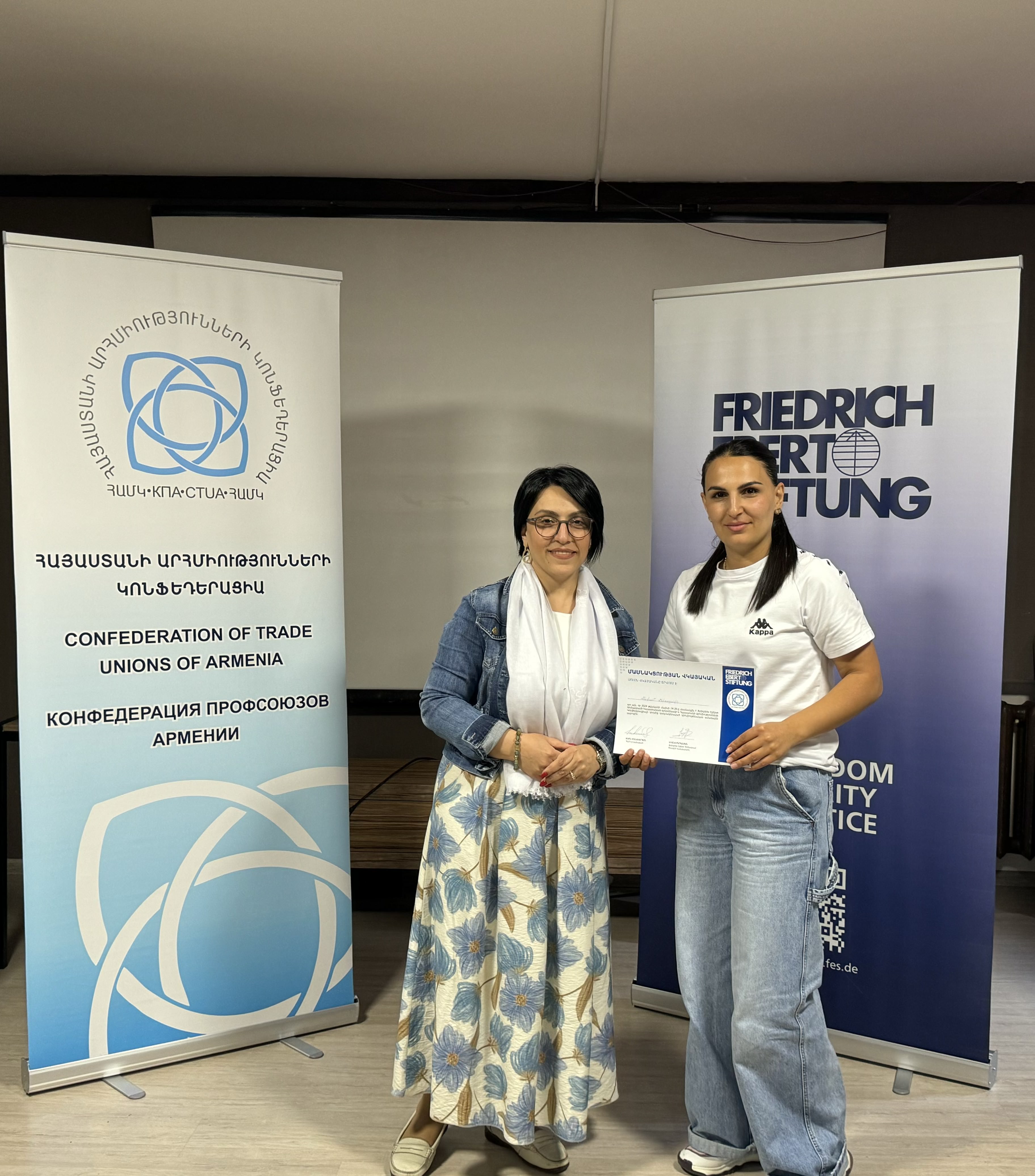 Արհմիութենականները ավարտական սերտիֆիկատներով պարգևատրվեցին Հայաստանի արհմիությունների կոնֆեդերացիայի նախագահ Էլեն Մանասերյանի կողմից։