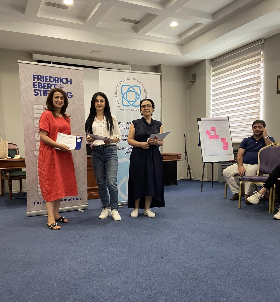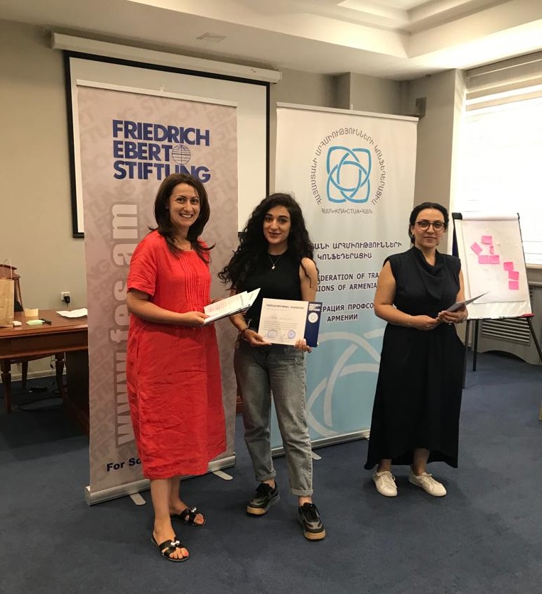Արհմիութենականները պարգևատրվեցին ավարտական սերտիֆիկատներով Ֆրիդրիխ էբերտ հիմնադրամի հայաստանյան գրասենյակի ծրագրերի համակարգող Լիանա Բադալյանի և ՀԱՄԿ-ի կազմակերպաուսումնական կենտրոնի ղեկավար Էլեն Մանասերյանի կողմից։