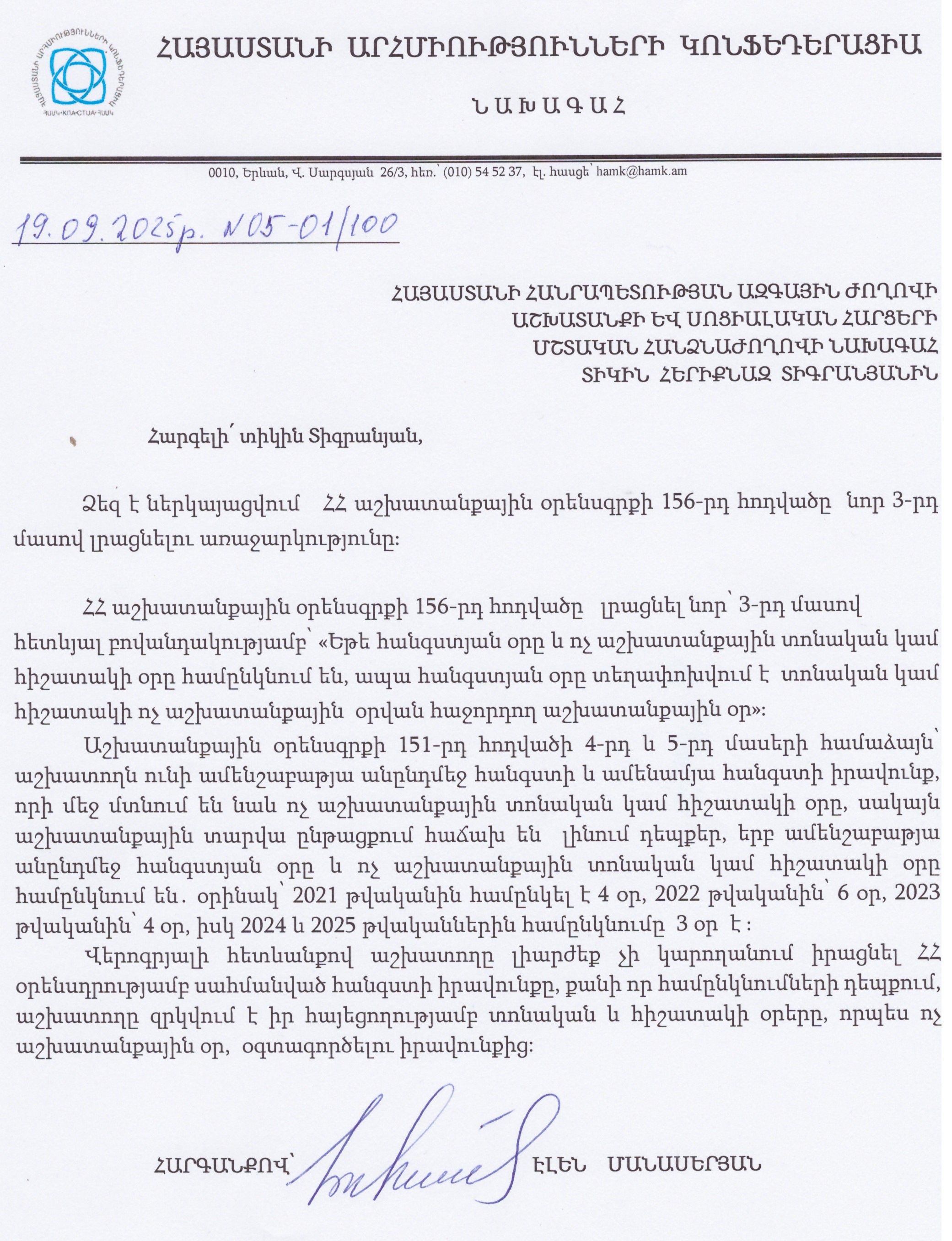 Հայաստանի արհմիությունների կոնֆեդերացիան ընդգծում է, որ նման փոփոխությունը կնպաստի աշխատավայրերում սոցիալական արդարության ամրապնդմանը և աշխատողների իրավունքների պաշտպանության բարձրացմանը: