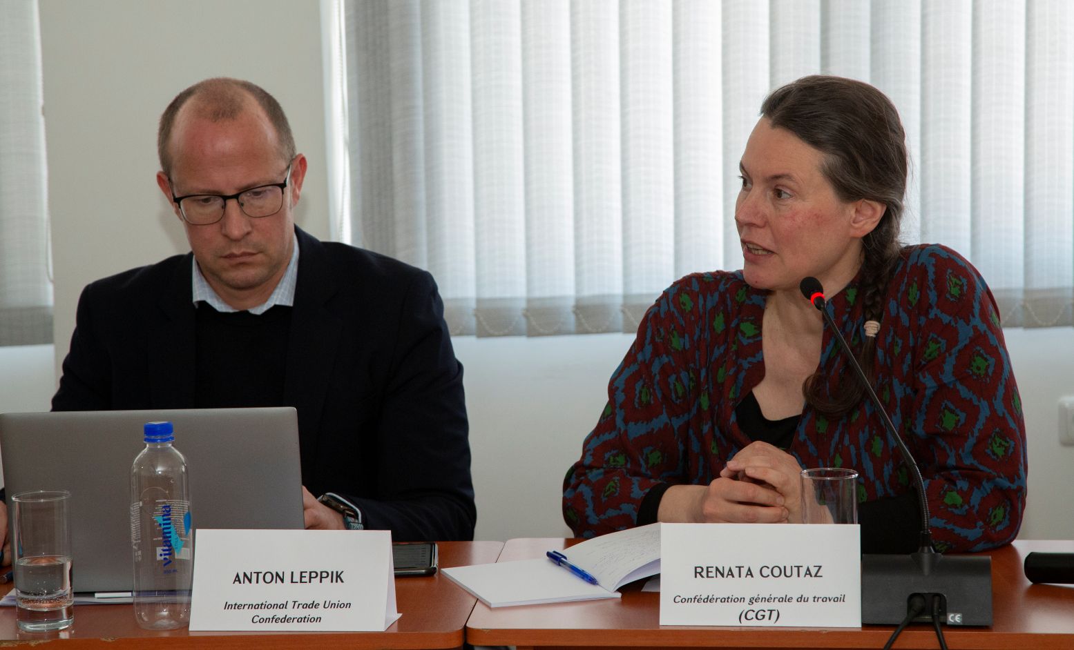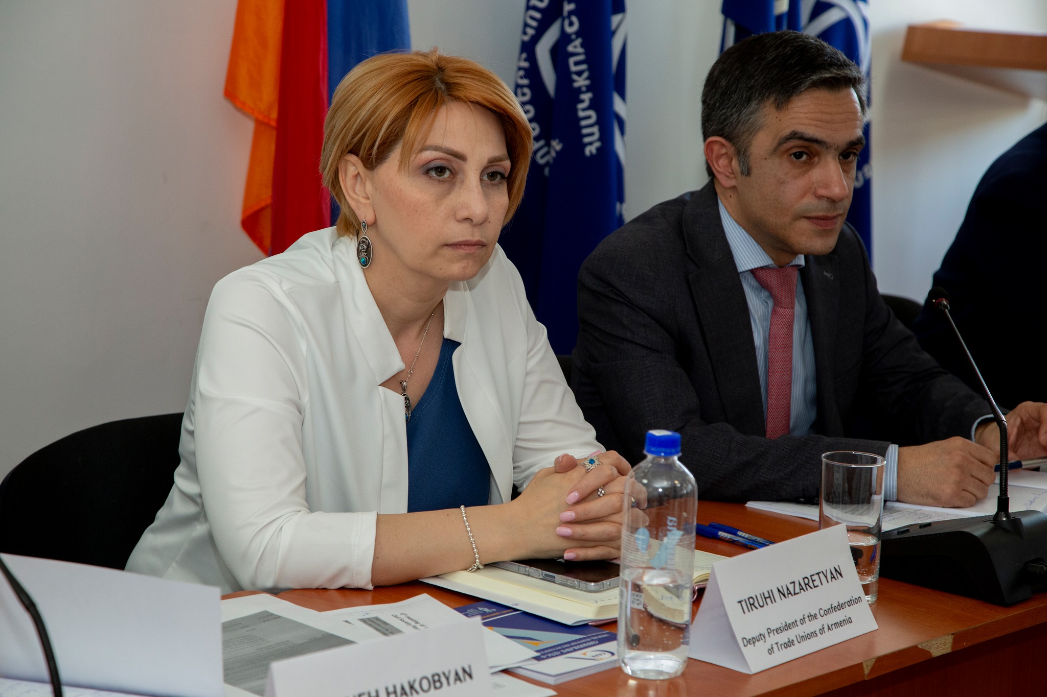 Սոցիալական երկխոսություն և աշխատանքային իրավունքներ թեմայով զեկուցումներով հանդես են եկել ՀՀ աշխատանքի և սոցիալական հարցերի նախարարի տեղակալ Ռուբեն Սարգսյանը, Հայաստանի արհմիությունների կոնֆեդերացիայի փոխնախագահ Տիրուհի Նազարեթյանը, Հայաստանի արհմիությունների կոնֆեդերացիայի իրավաբան Աննա Բարիկյանը։